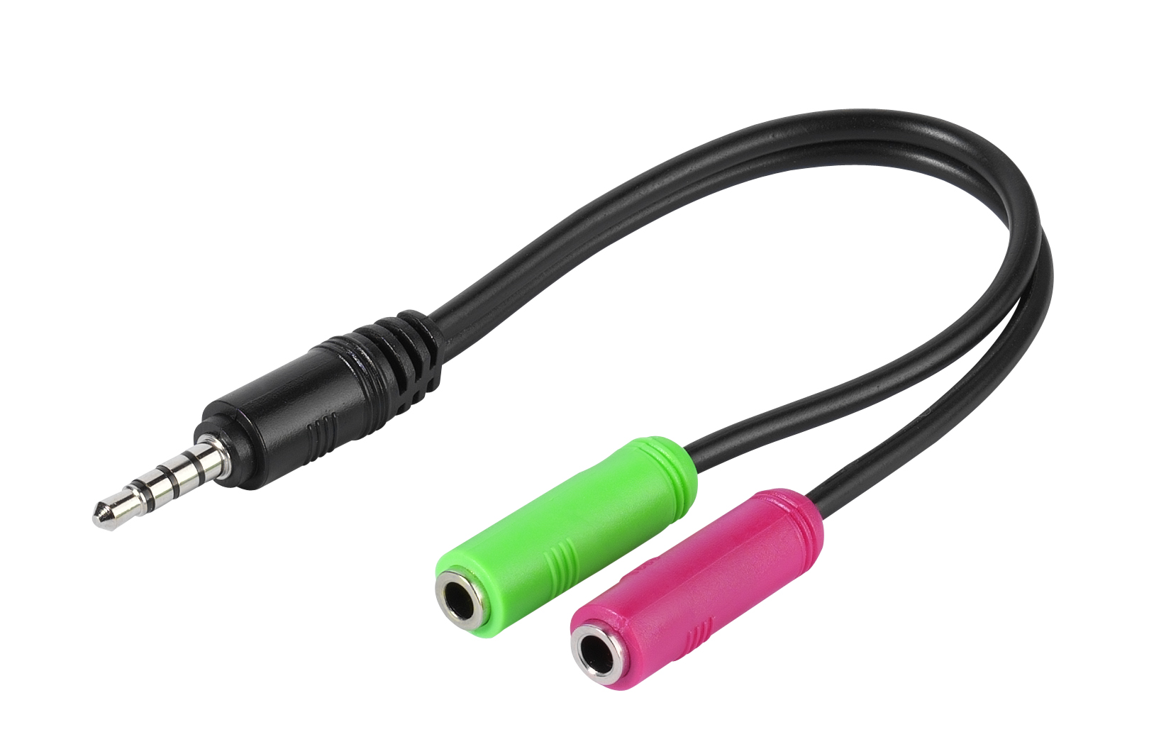 For connection of headsets with two 3.5 mm plugs (1 x microphone, 1 x headphone), to smartphones or tablets with only one 3.5 mm input (4 pin, microphone and headphone combined).