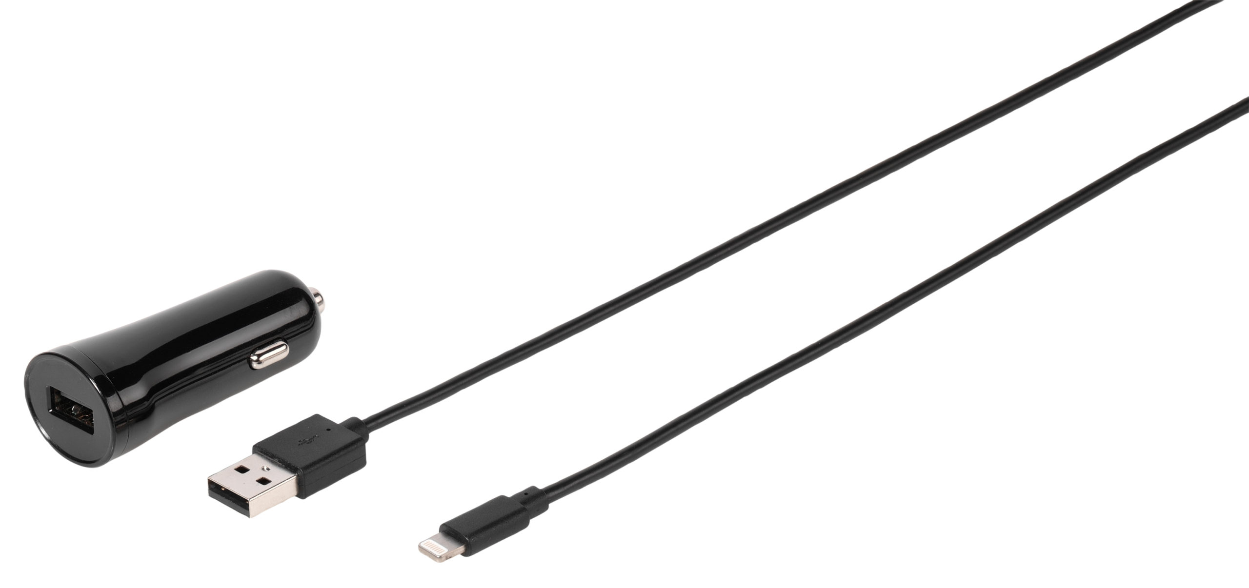 Fast Charging 2.4 A iPhone/iPad USB car charger with separate 1.2m lightning cable, MFI, Black