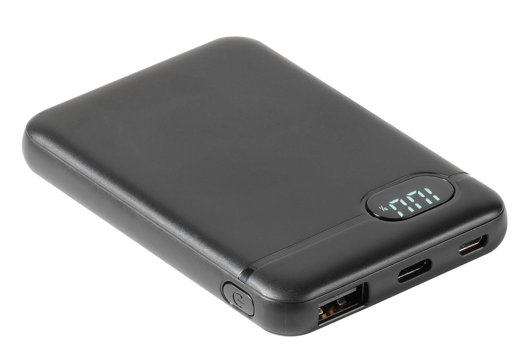 Compact USB-C Powerbank with capacity status LCD display for charging of mobile devices like Smartphone, Tablet and others.