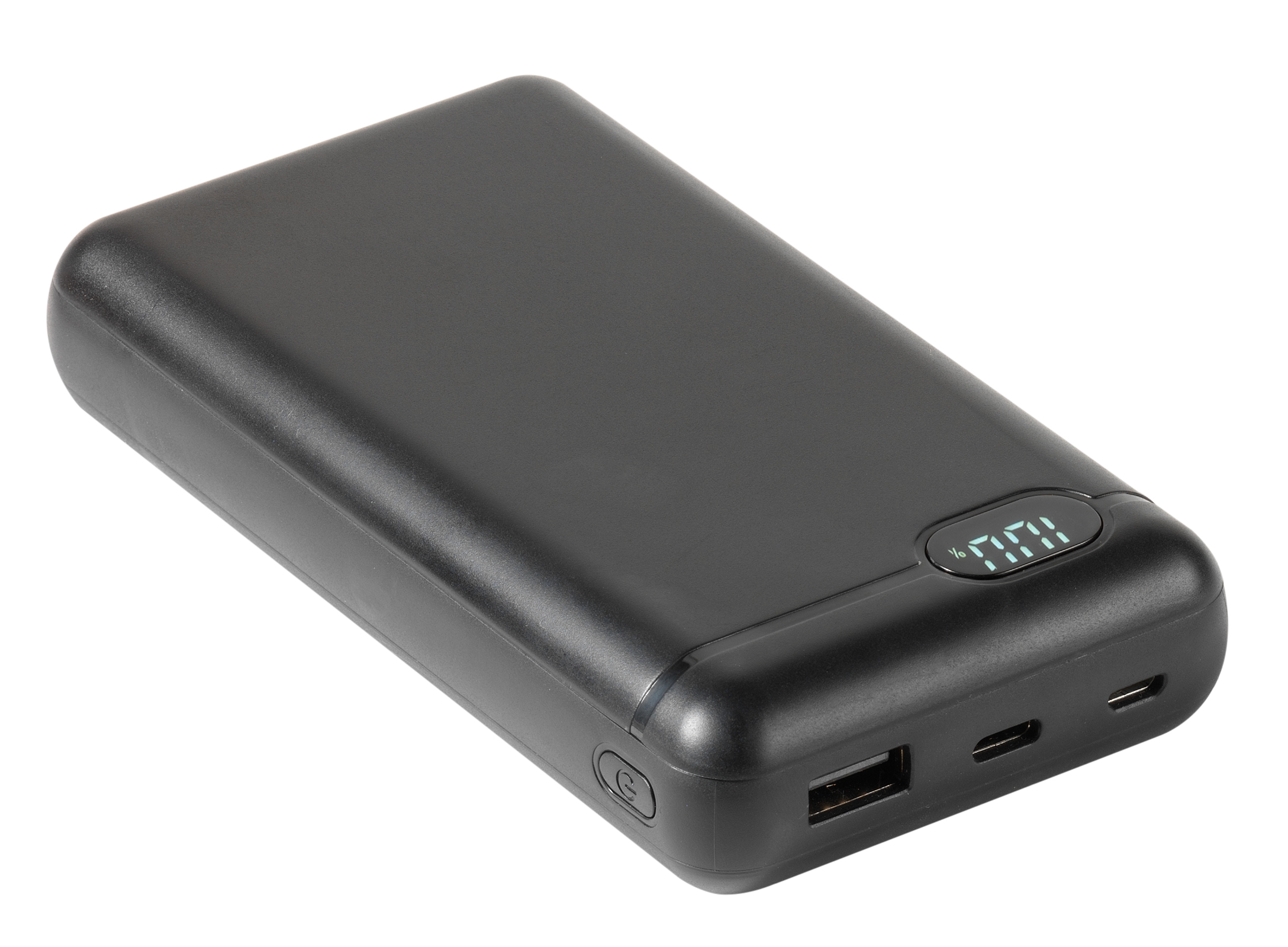 Compact USB-C Powerbank with capacity status LCD display for charging of mobile devices like Smartphone, Tablet and others.