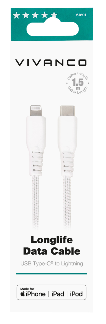 High-quality Longlife Apple Lightning to USB-Type-C® data cable for charging and synchronization of Apple iPhone and other devices with Lightning- / USB-C connection.
