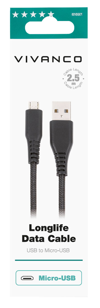 Longlife Micro USB 2.0 Sync and Charging Cable USB A-Male to Micro B-Male 2.5m, black