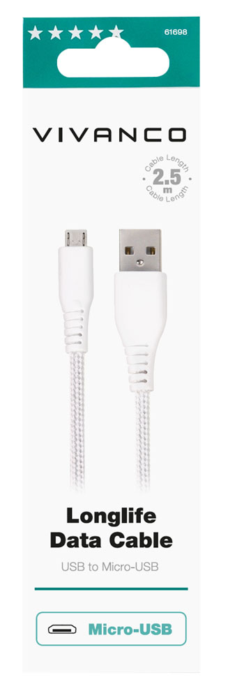 Longlife Micro USB 2.0 Sync and Charging Cable USB A-Male to Micro B-Male 2.5m, white