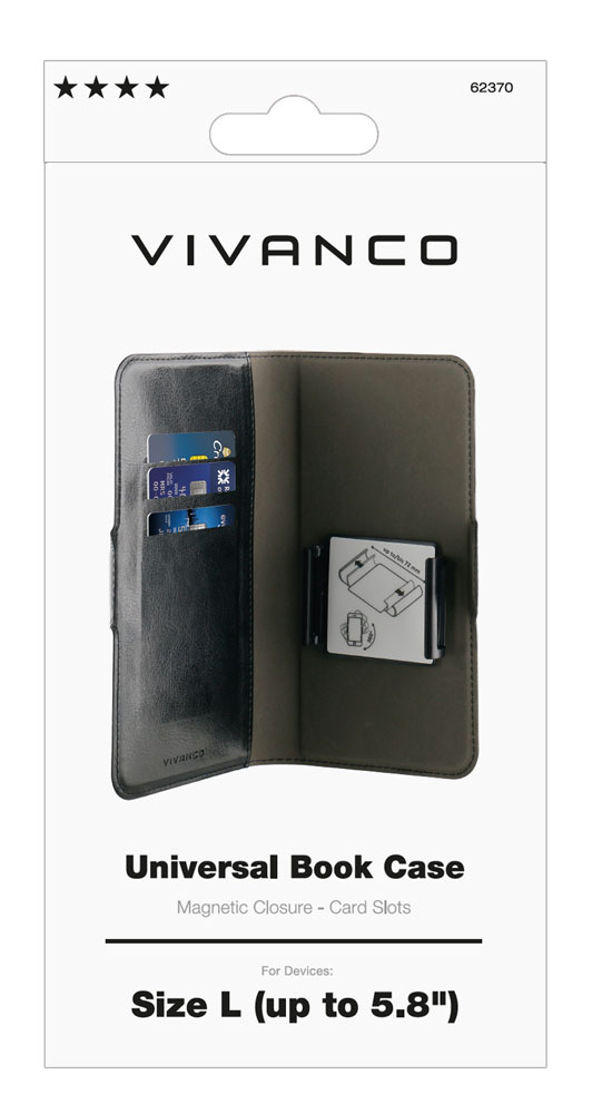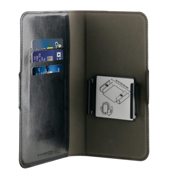 This protective universal wallet case has three credit card compartments and compatible for any devices with max. measurement 140 x 70mm (4.6” – 5.7”) . The case is made of durable materials and protects your device against bumps and scratches in daily use. The elegant material looks and feels high quality and the case design allows full access to all ports and device connections. Holder part can be rotated for taking pictures etc.
