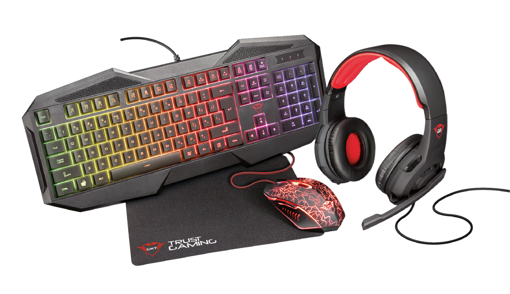 4 in 1 Gaming bundle, with comfortable headset, rainbow wave illuminated keyboard & optical mouse and non-slip mouse pad