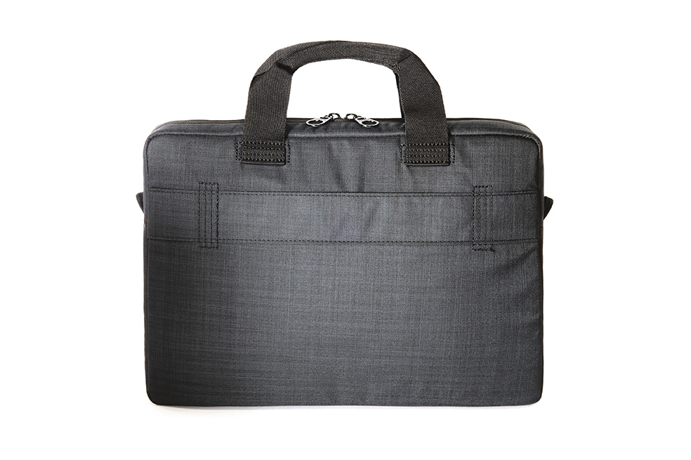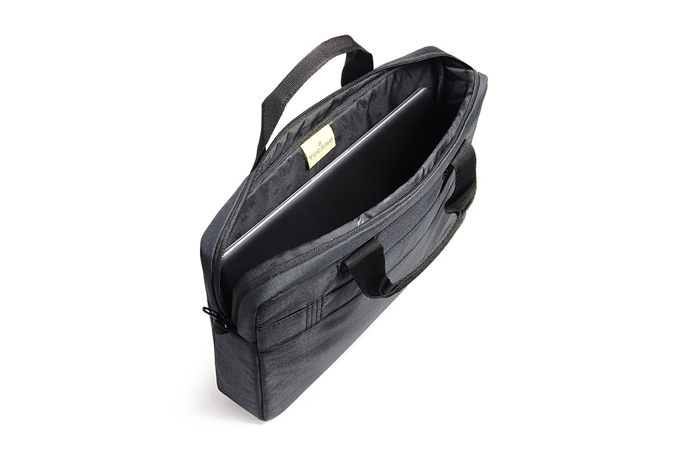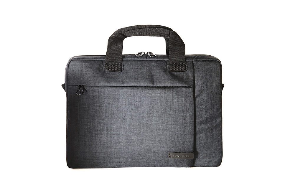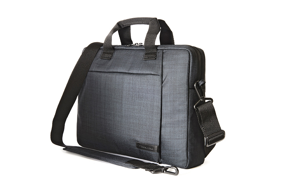 Compact bag compatible with Notebook and Ultrabook 13.3″ and 14″. The design created by the horizontal zip pocket and vertical seam characterises the bag, giving it a contemporary, professional look. The main compartment is purposely reinforced to protect your laptop. The front pocket is equipped with a retainer organised into specific pockets for your Smartphone (up to 5.5″), Power Bank and business cards. The bag also has a convenient detachable padded shoulder strap and a useful band for trolley transport which is situated on the back panel.