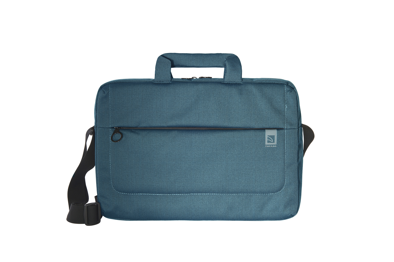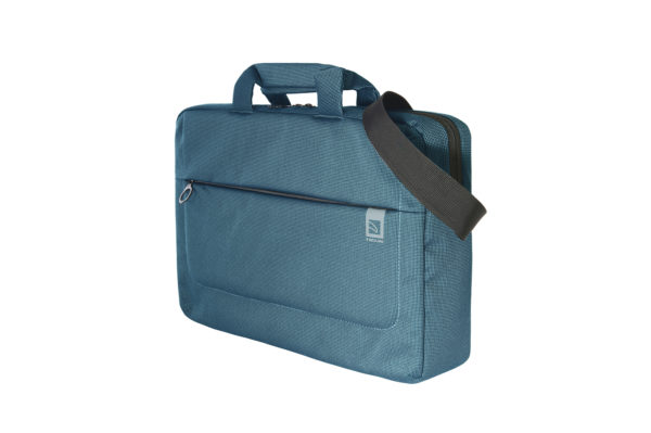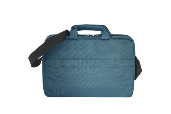 Slim bag in two-tone fabric for notebooks, ultrabooks and MacBooks up to 13”. The interior compartment features a strap with Velcro to secure and protect your device. The external front panel features an accessory pocket and the back is equipped with a trolley strap. Non-removable, webbing shoulder strap