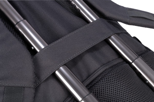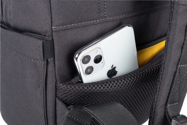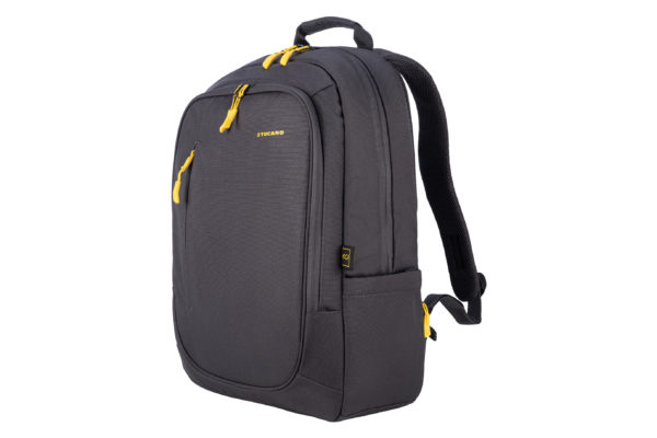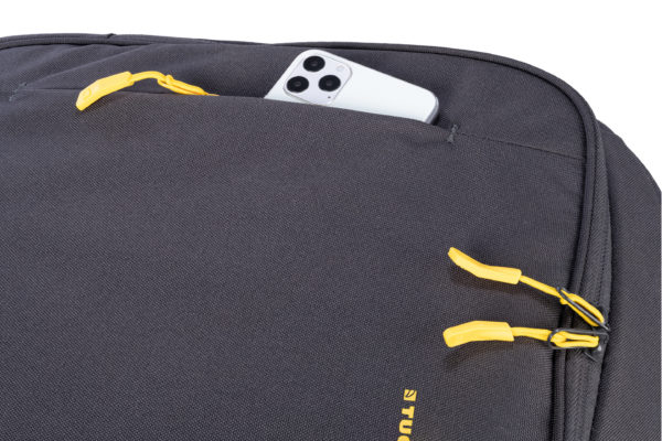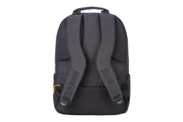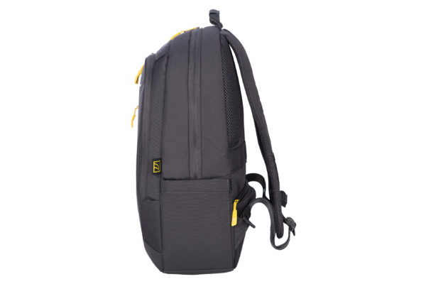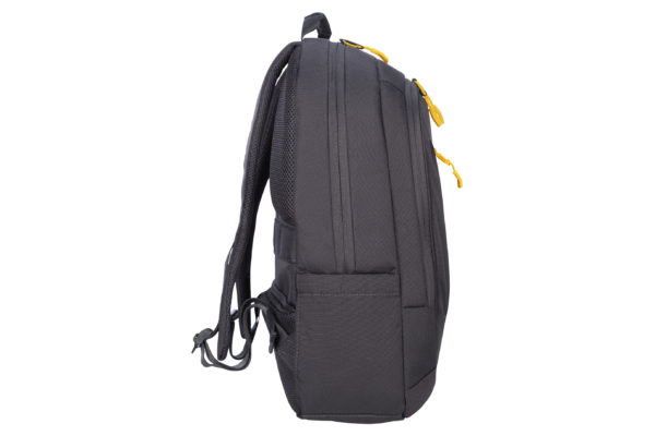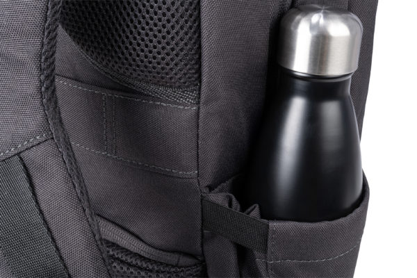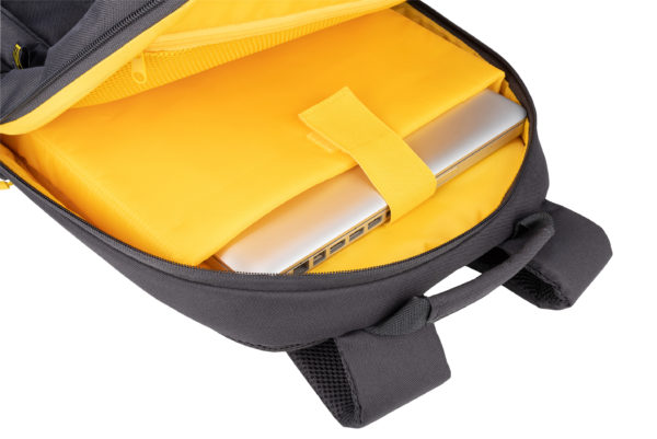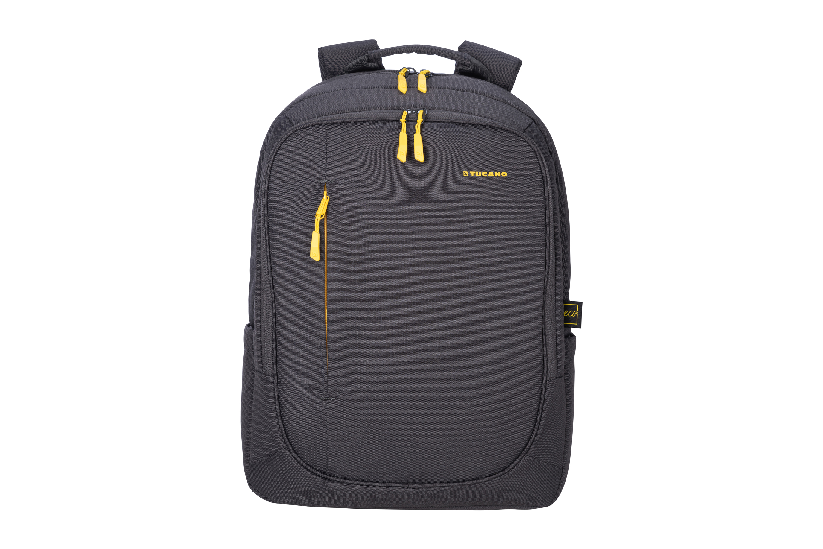 Two-tone laptop backpack up to 17″ and MacBook 16″ in 100% recycled fabric from PET bottles. The padded, lined interior features a protective pocket for your laptop or tablet. The front side has an accessorized front pocket and the back side has adjustable shoulder straps and a strap for attaching to the trolley. On the side, the backpack has two comfortable pockets for umbrella and water bottle. Safety pocket on the back.