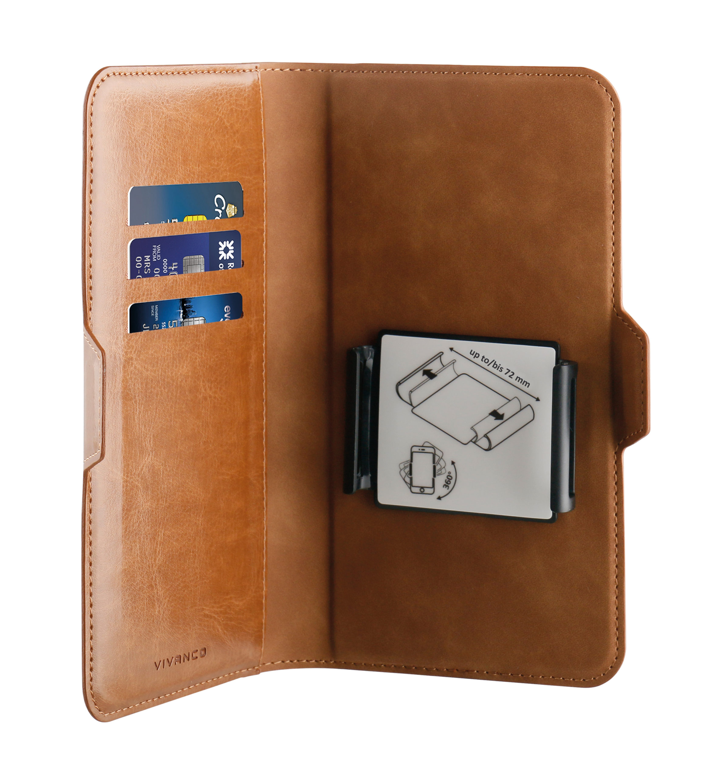 Detta skyddande universella plånboksfodral har tre kreditkortsfack och kompatibelt för alla enheter med max. mått 140 x 70 mm (4,6 ”- 5,7”). Väskan är gjord av hållbara material och skyddar din enhet mot stötar och repor vid daglig användning. Det eleganta materialet ser ut och känns av hög kvalitet och fodralets design ger full åtkomst till alla portar och enhetsanslutningar. Hållardelen kan roteras för att ta bilder etc.