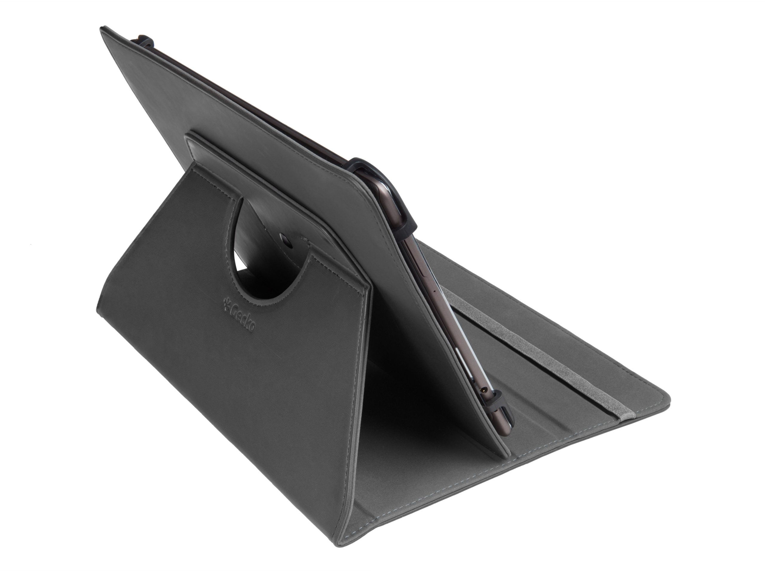 Gecko Covers fodral är robusta, snygga och tillverkade av högkvalitativa material. Detta universella foliofodral ger ett utmärkt skydd och passar 10″ surfplattor med en maximal storlek på 262x185x10mm. Lämplig för horisontell och vertikal användning i olika visningslägen med 360° rotation.